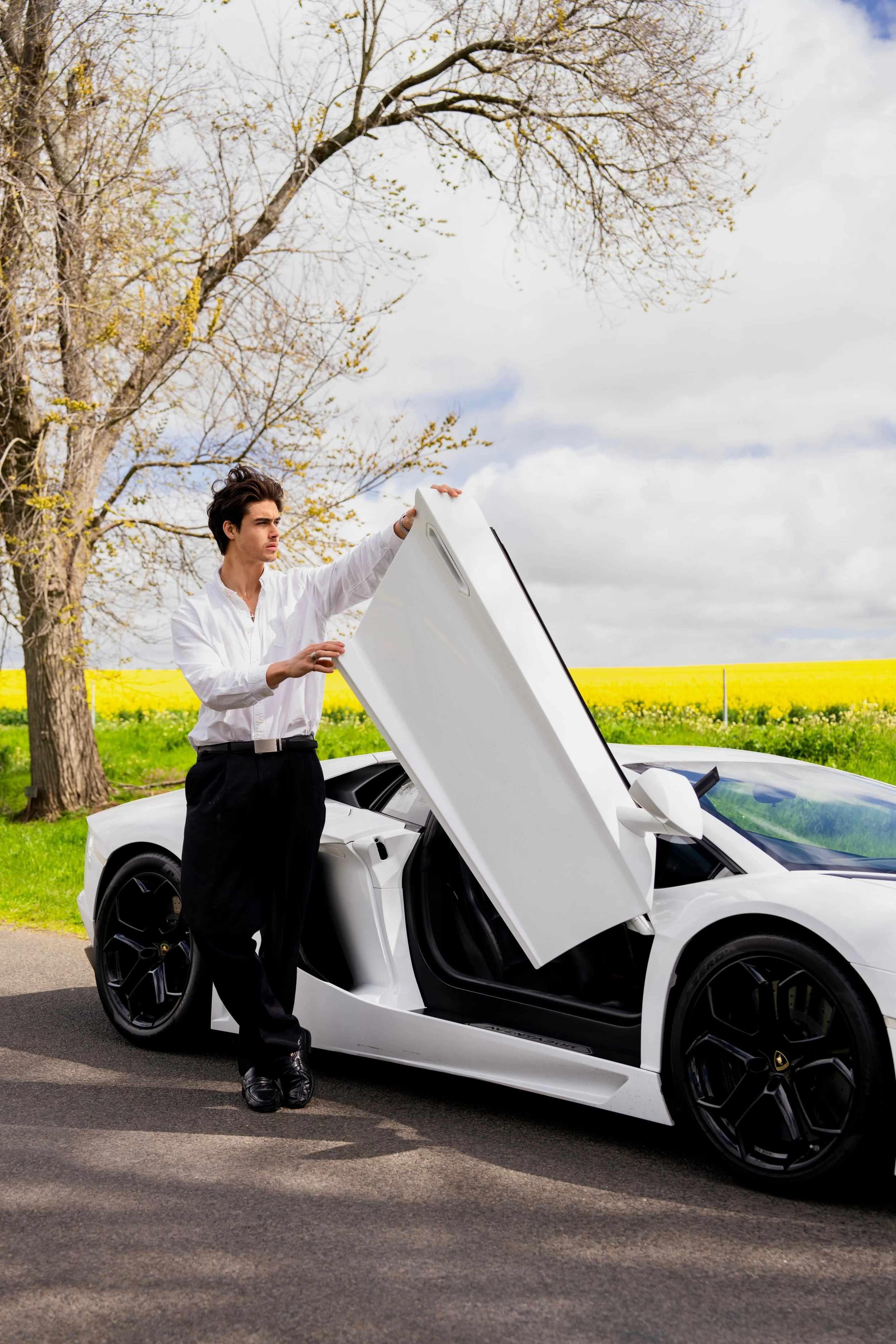A man dressed in a white shirt and black pants standing next to a white sports car with its gull-wing door open, outdoors on a paved road with a grassy field and trees in the background.