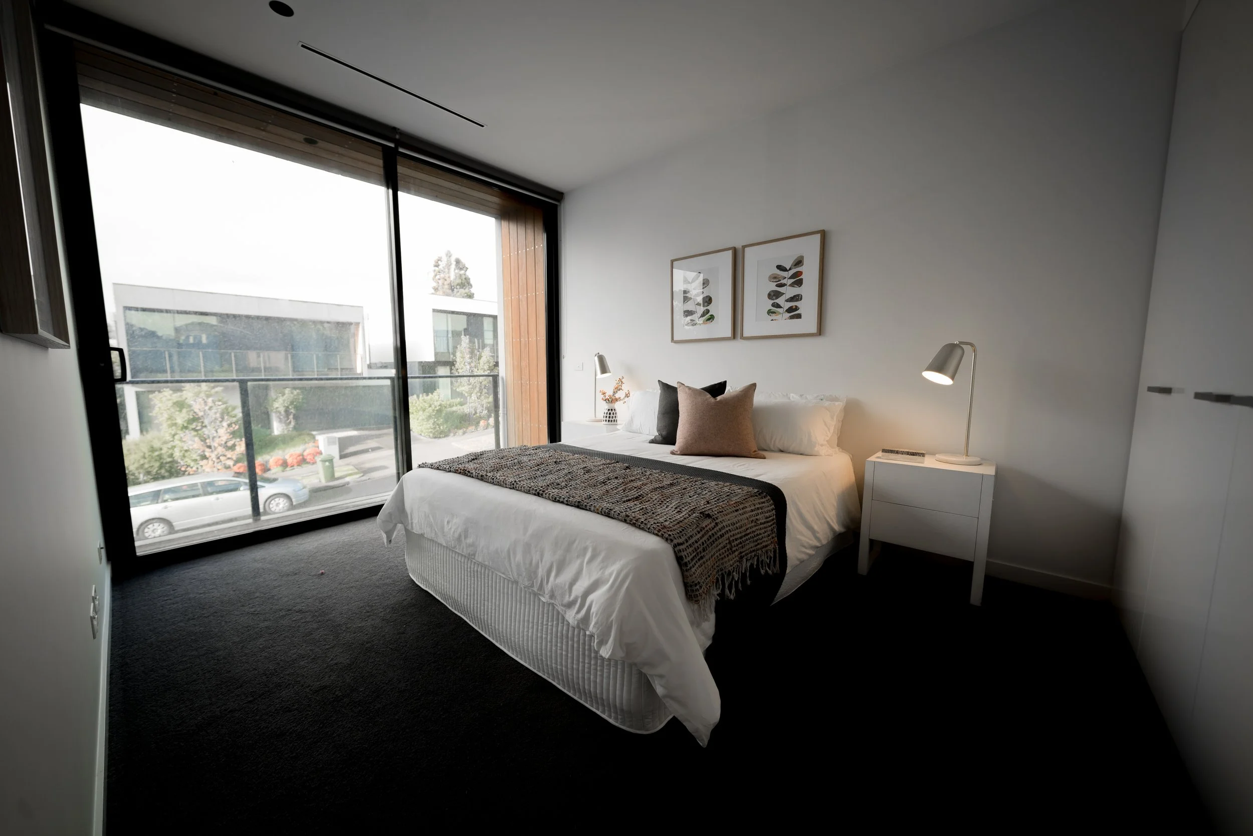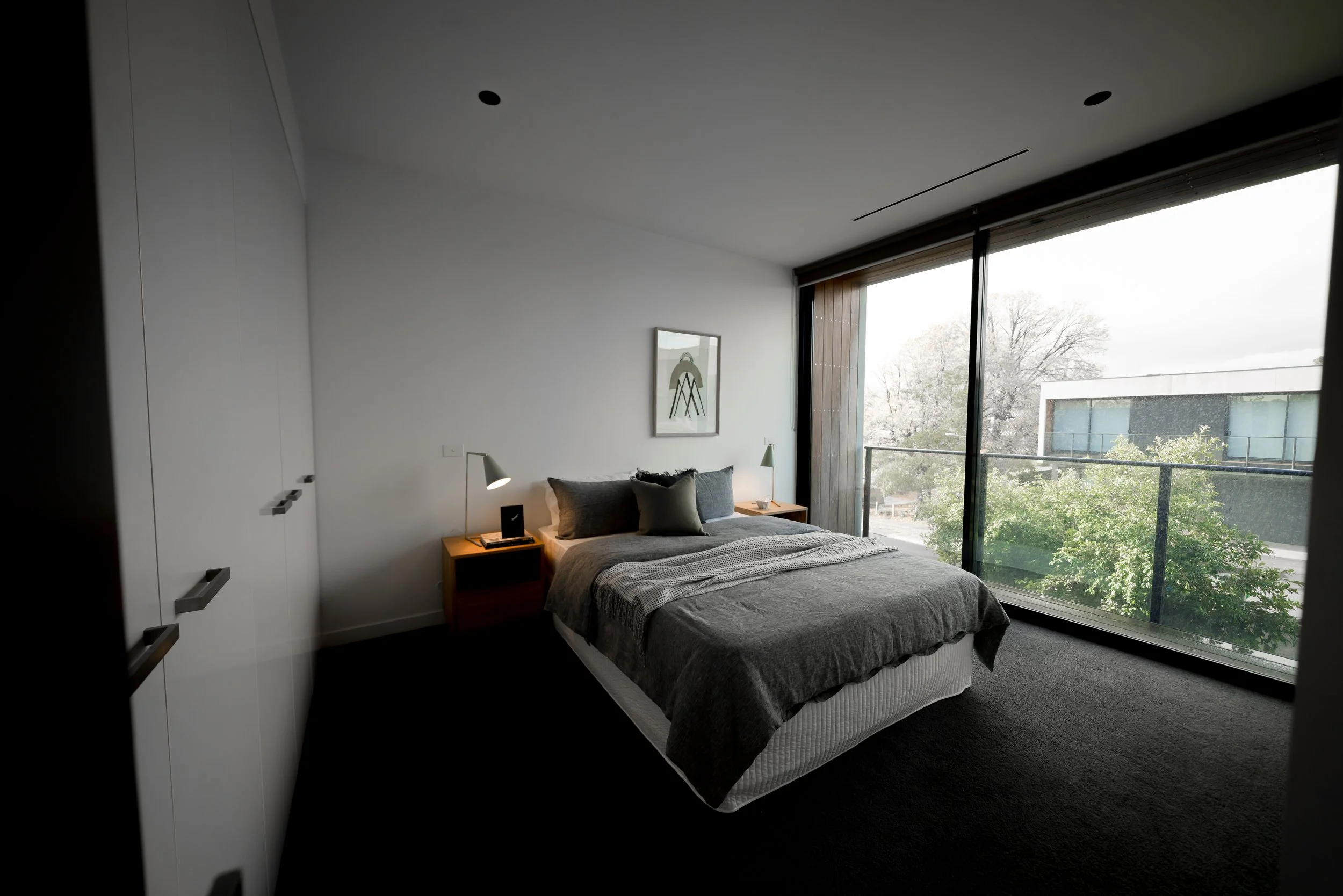Modern bedroom with a large bed, decorative pillows, a bedside table with a lamp, and large floor-to-ceiling windows showing a city view.